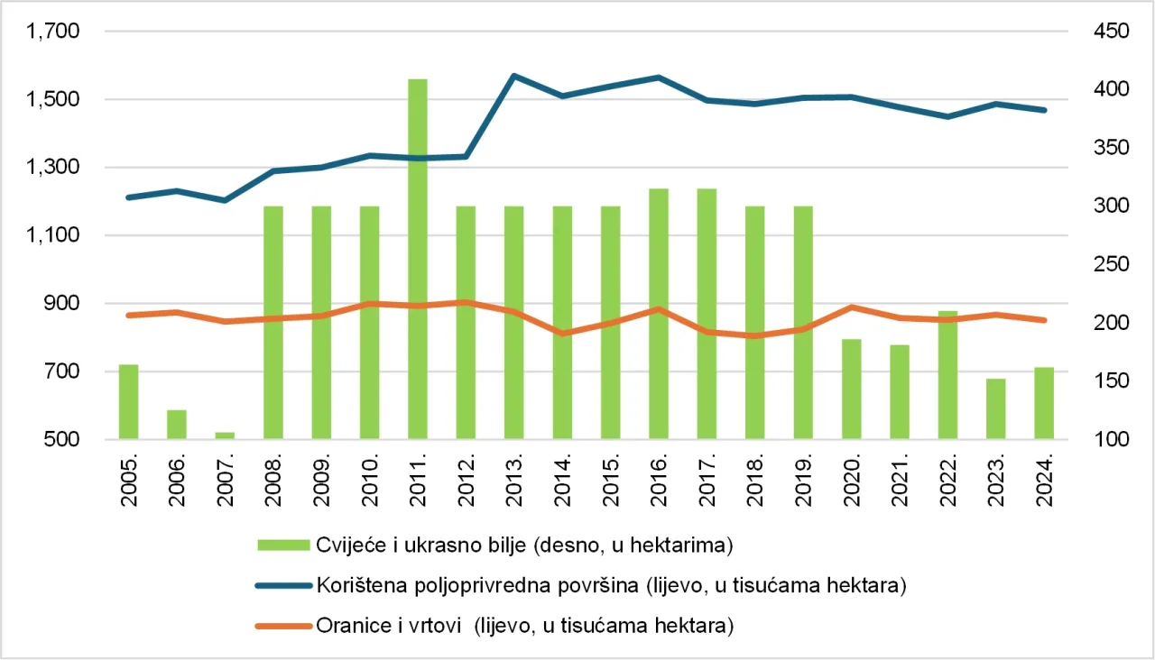 Prema posljednjim dostupnim podacima Državnog zavoda za statistiku, korištena površina poljoprivrednog zemljišta pod cvijećem i ukrasnim biljem u 2024. godini bila je 162 hektara (slika 3.). To je gotovo dvostruko manje u usporedbi s 2019. godinom kada je korištena površina pod cvijećem iznosila 300 hektara. Udio korištene površine pod cvijećem i ukrasnim biljem u ukupnoj površini poljoprivrednog zemljišta Republike Hrvatske se u razdoblju 2019. – 2024. prepolovio, smanjivši se s 0,02 posto na 0,01 posto.