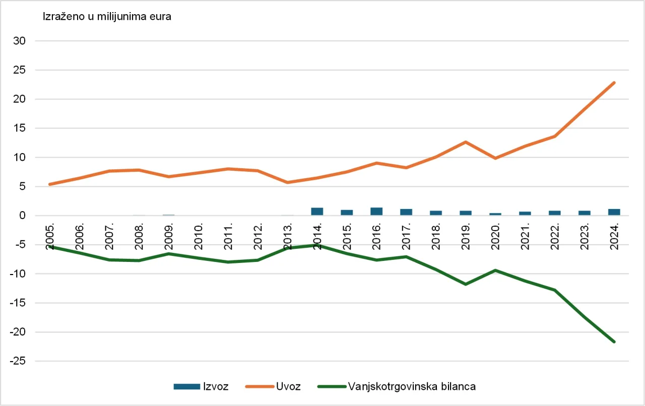 Slika 4. Izvoz, uvoz i vanjskotrgovinska bilanca Hrvatske u trgovini cvijećem u razdoblju 2005. – 2024.