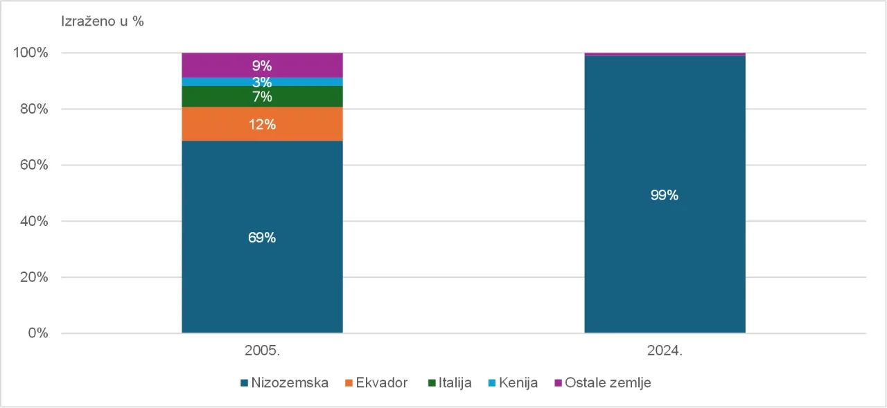 Iako Hrvatska već godinama najviše cvijeća uvozi iz Nizozemske, uvozna se struktura u razdoblju od 2005. do 2024. godine ipak značajnije mijenjala. Hrvatska je iz uvozne dominacije nizozemskog cvijeća prešla u uvoznu ovisnost o nizozemskom cvijeću. Naime, u 2005. godini udio Nizozemske u uvoznoj strukturi cvijeća Republike Hrvatske iznosio je 69,0 posto. Slijedili su je Ekvador s udjelom od 12,0 posto, Italija s udjelom od 7,0 posto i Kenija s udjelom od 3,0 posto. Protekom vremena Nizozemska je sve više povećavala svoju zastupljenost u ukupnom uvozu cvijeća Republike Hrvatske, da bi se taj udio u 2024. godini popeo na 99,0 posto. U prijevodu, Hrvatska danas gotovo sve cvijeće uvozi iz Nizozemske. Taj proces preuzimanja potpune dominacije nizozemskog cvijeća u uvoznoj strukturi Hrvatske naročito je bio pospješen nakon pristupanja Hrvatske Europskoj uniji.