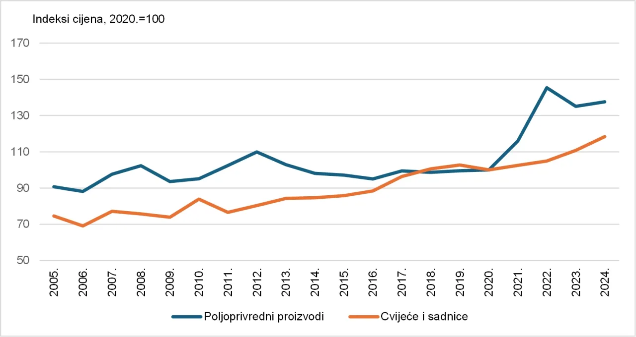 Slika 6. Indeksi cijena poljoprivrednih proizvoda i cijena cvijeća i sadnica u Republici Hrvatskoj u razdoblju 2005. – 2024.