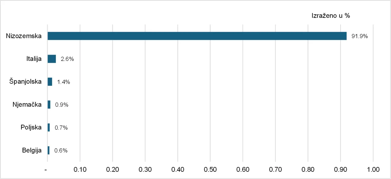 Slika 7. Najveći izvoznici cvijeća među zemljama EU-a mjereno udjelom u ukupnom izvozu cvijeća Europske unije u 2024. godini