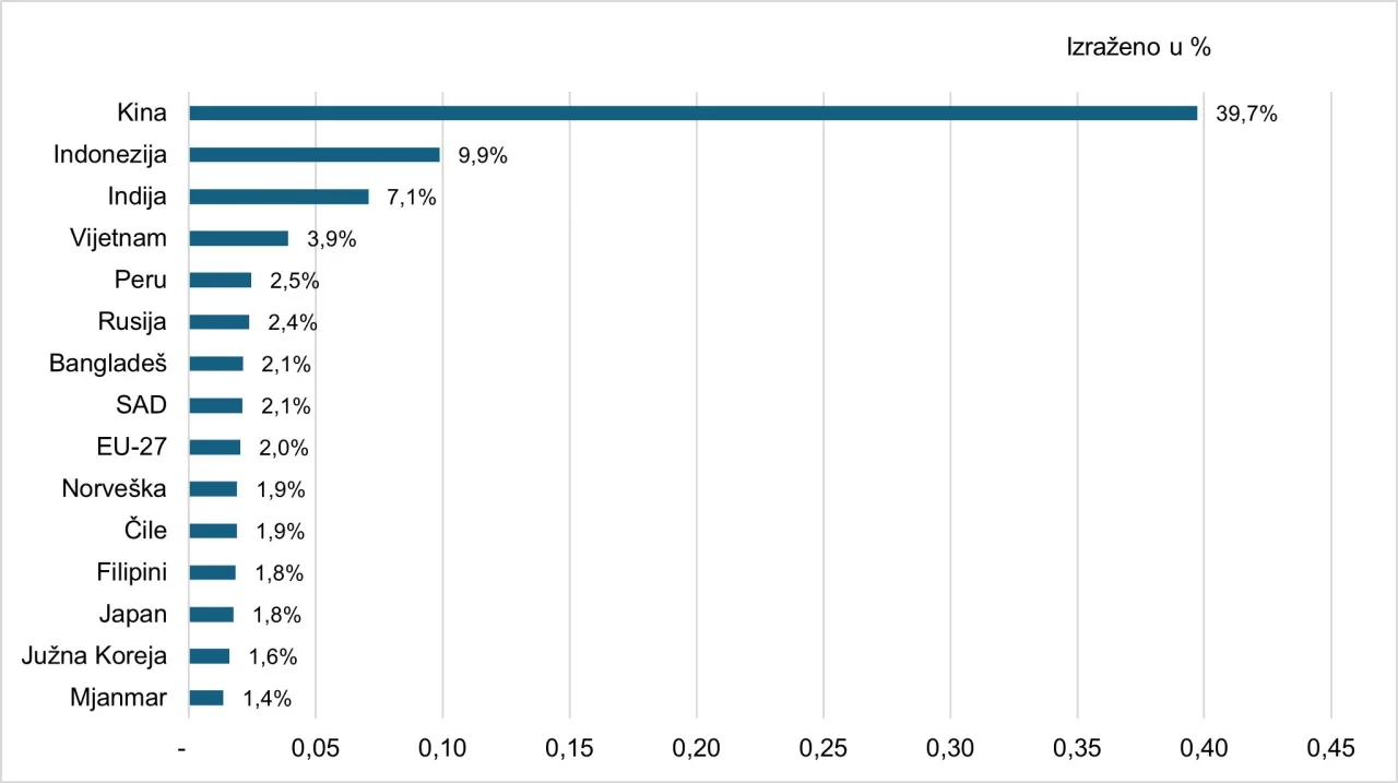 Najveći proizvođač plodova mora u svijetu je Kina, koja zauzima 39,7 posto ukupne svjetske proizvodnje (slika 1.). Slijede je Indonezija s udjelom od 9,9 posto i Indija s udjelom od 7,1 posto.