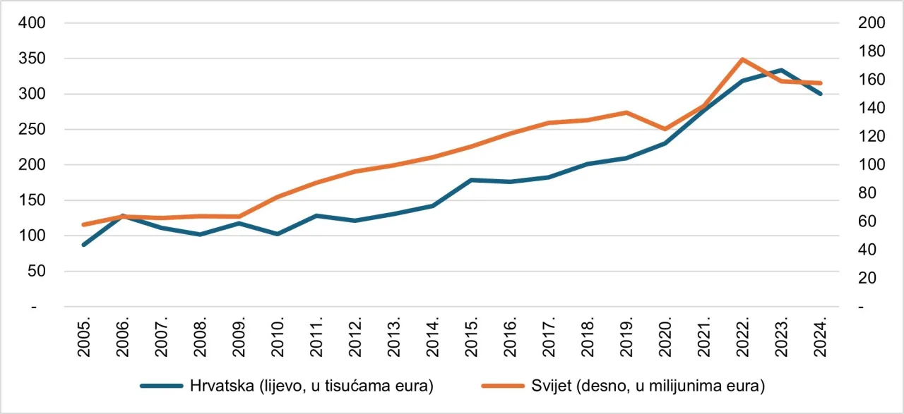 Slika 3. Izvoz plodova mora Hrvatske i svijeta u razdoblju 2005. – 2024.
