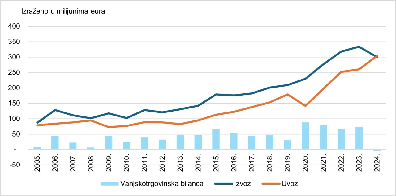 Izdvojeno promatrajući najnovija kretanja vanjskotrgovinske bilance Hrvatske u razmjeni plodovima mora, zapaža se trend njezina pogoršavanja. Hrvatska je iz dugotrajnog razdoblja pozitivne bilance prešla u negativan saldo (slika 4.). U 2024. godini on je iznosio 3,9 milijuna eura. Rezultat je to značajnog pada izvoza, naročito izraženog u već spomenutoj 2024. godini, ali i snažnog uvoznog rasta. Uvoz plodova mora u 2024. godini povećao se za 43,7 milijuna eura, dok se izvoz smanjio za 33,3 milijuna eura.