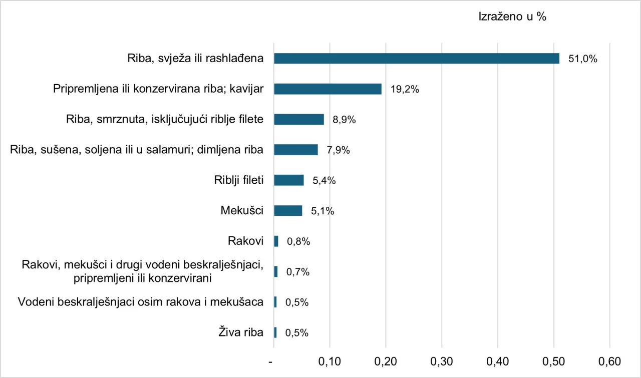 Uz izraženu koncentraciju plasmana po izvoznim odredištima, doprinos padu konkurentnosti u međunarodnoj trgovini dala je i relativno slaba diversifikacija proizvodne strukture. Kod plasmana plodova mora Hrvatske na svjetska tržišta apsolutna dominacija pripada izvozu ribe, svježe ili rashlađene. Ta proizvodna grupa u 2024. godini čini 51,0 posto ukupnog hrvatskog izvoza morskih plodova (slika 5.). Slijede je pripremljena ili konzervirana riba; kavijar s udjelom od 19,2 posto, riba smrznuta, isključujući riblje filete s udjelom od 8,9 posto i riba, sušena, soljena ili u salamuri; dimljena riba s udjelom od 7,9 posto.