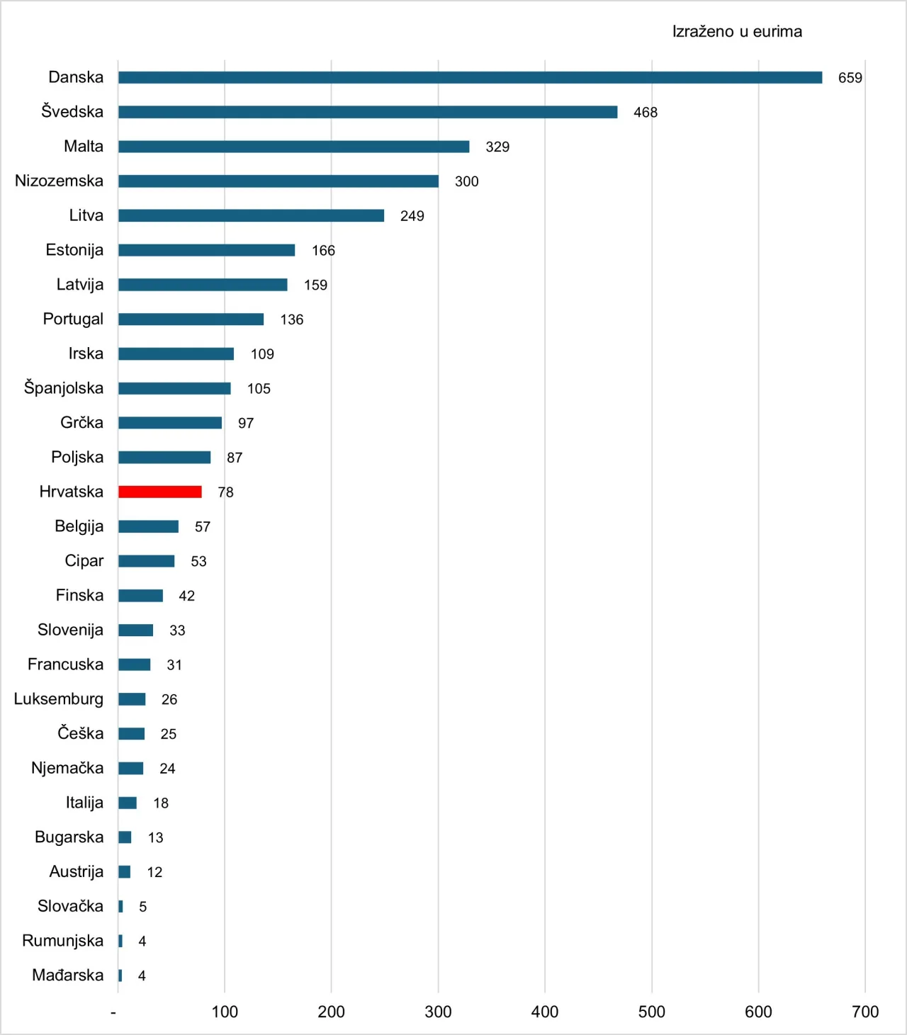 Analiza izvoza plodova mora Europske unije po stanovniku pokazuje da su predvodnice europskog izvoza skandinavske zemlje Danska i Švedska (slika 8.). Pritom je izvoz plodova mora po stanovniku u 2024. godini u Danskoj iznosio 659 eura, a u Švedskoj 468 eura. U odnosu na vodeću Dansku, Hrvatska ostvaruje 8,4 puta manji izvoz plodova mora po stanovniku. S ostvarenih 78 eura izvoza plodova mora po stanovniku, Hrvatska se nalazi na trinaestom mjestu na ljestvici zemalja Europske unije.