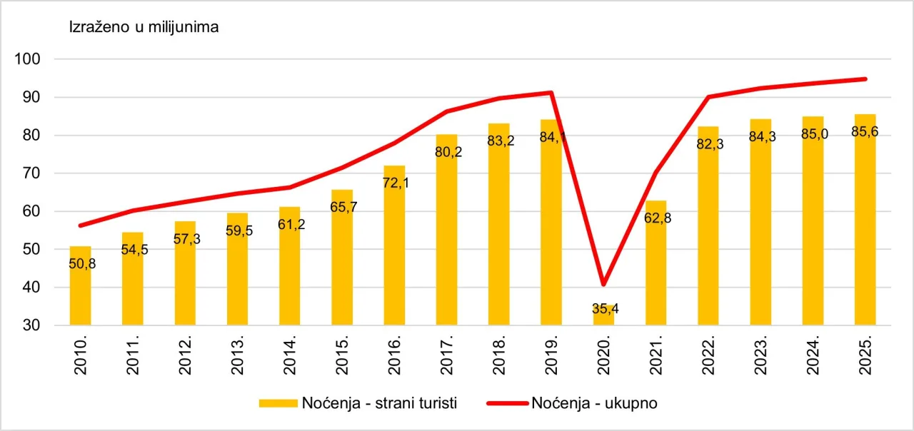 Valja pridodati, kako je 2025. godina premašila rezultate iz pretpandemijske 2019. Pritom je broj noćenja u 2025. godini bio veći za 3,9 posto nego u 2019. godini (slika 3). Prema očekivanjima u strukturi ukupnih noćenja prevladavaju strani turisti, koji su ostvarili 90,3 posto noćenja, dok su domaći gosti ostvarili 9,7 posto noćenja.