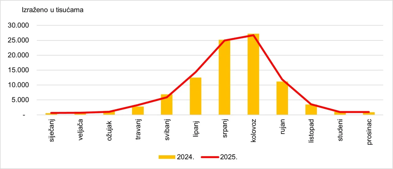 Istovremeno u srpnju i kolovozu je došlo do blagog smanjenja broja noćenja na godišnjoj razini. Pritom se broj noćenja u srpnju smanjio za 0,8 posto, a u kolovozu za 1,7 posto. Opisani trendovi potvrđuju nastavak trenda smanjivanja sezonalnosti hrvatskog turizma u 2025. godini.