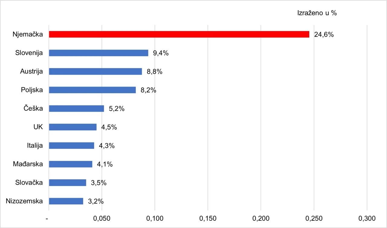 Nijemci su već tradicionalno najbrojniji gosti u Hrvatskoj. Pritom su turisti iz Njemačke u 2025. ostvarili 21 milijun noćenja. To je 24,6 posto ukupno ostvarenih noćenja stranih turista. Slijede ih turisti iz Slovenije s 9,4 posto udjela, Austrije s 8,8 posto udjela, Poljske s 8,2 posto udjela i Češke s 5,2 posto udjela u ukupnom broju noćenja stranih gostiju. Noćenja koja su ostvarili turisti iz navedenih pet zemalja čine 56,1 posto ukupnog broja noćenja stranih turista u Hrvatskoj. Pribroje li im se noćenja koja su ostvarili turisti iz Ujedinjene Kraljevine, Italije, Mađarske, Slovačke i Nizozemske, vidljivo je kako turisti iz svega deset zemalja ostvaruju 75,8 posto ukupnog broja noćenja stranih turista.