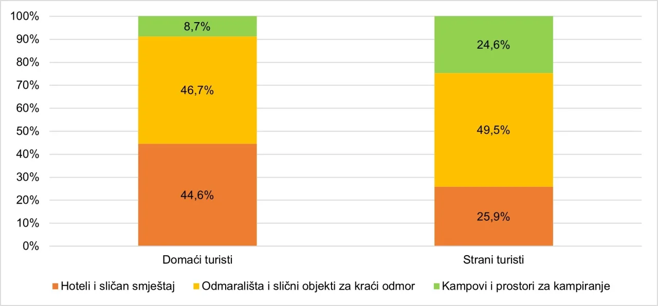 U hotelima i sličnom smještaju domaći su turisti prošle godine ostvarili 44,6 posto ukupnog broja noćenja domaćih turista, što je iznad udjela stranih turista od 25,9 posto. S druge strane, u kampovima i prostorima za kampiranje ostvareno je svega 8,7 posto ukupnog broja noćenja domaćih turista, što je značajno ispod udjela u strukturi noćenja stranih turista koji je iznosio već spomenutih 24,6 posto.