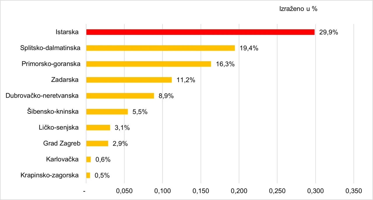 Sa ostvarenih 5 milijuna dolazaka i 28,3 milijuna noćenja Istarska-županija se i u 2025. godini potvrdila šampionom hrvatskog turizma. Ta županija čini 24,1 posto ukupnog broja turističkih dolazaka u Hrvatskoj te je u njoj ostvareno 29,9 posto ukupnih noćenja (slika 7). Iza Istre, na drugom mjestu je Splitsko-dalmatinska županija s udjelom u ukupnom broju noćenja Hrvatske od 19,4 posto, dok je na trećem mjestu Primorsko-goranska županija s udjelom od 16,3 posto. Kumulativno, u obalnim županijama ostvareno je 94,3 posto ukupnog broja noćenja Hrvatske.