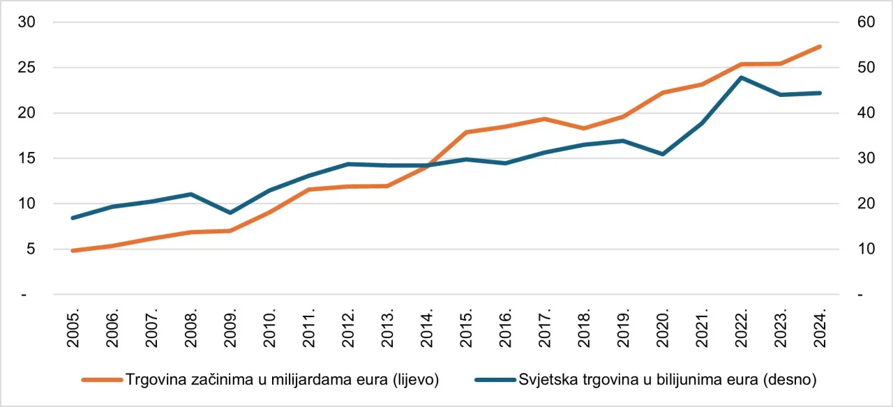 Slika 1. Ukupna svjetska trgovina i trgovina začinima u razdoblju 2005. – 2024.