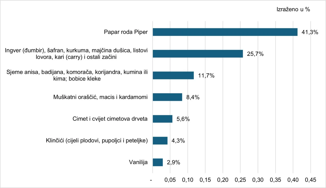 Strukturna analiza globalnog izvoza začina u 2024. godini prema vrstama začina potvrđuje najveću zastupljenost papra roda Piper u ukupnom izvozu (slika 2.). Slijede ga ingver (đumbir), šafran, kurkuma, majčina dušica, listovi lovora, kari (curry) i ostali začini te sjeme anisa, badijana, komorača, korijandra, kumina ili kima; bobice kleke.