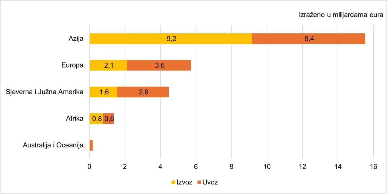 Rezultati analize trgovine začinima po kontinentima pokazuju kako vodeću ulogu ima Azija. Na azijski kontinent otpada 57,0 posto ukupne svjetske trgovine začinima. Azija je ujedno i najveći apsolutni izvoznik začina s ostvarenim izvozom začina u 2024. godini u iznosu od 9,2 milijarde eura (slika 3.). Slijede je Europa s izvozom od 2,1 milijardu eura, Sjeverna i Južna Amerika s izvozom od 1,6 milijardi eura, Afrika s izvozom od 800,0 milijuna eura te Australija i Oceanija s ostvarenim izvozom od 44,0 milijuna eura.