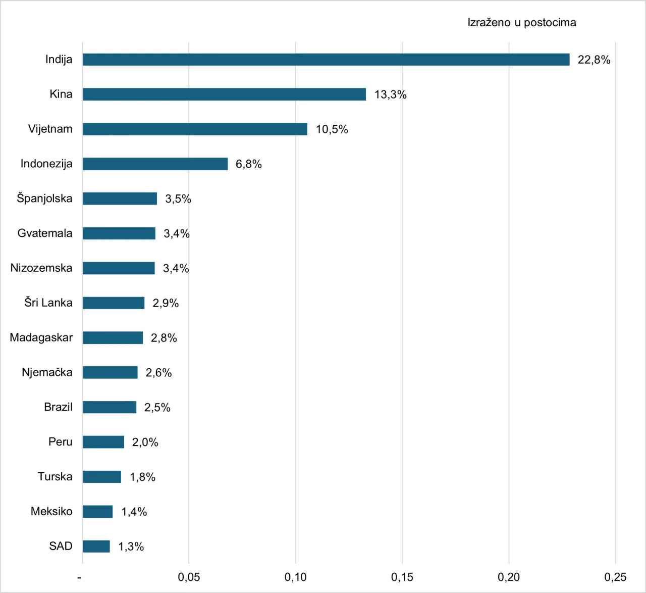 Najveći proizvođač i izvoznik začina u svijetu je Indija (slika 4.). Slijede je Kina, Vijetnam, Indonezija i Španjolska. Indija je u 2024. godini realizirala 22,8 posto svjetskog izvoza začina, Kina 13,3 posto, Vijetnam 10,5 posto, Indonezija 6,8 posto i Španjolska 3,5 posto.
