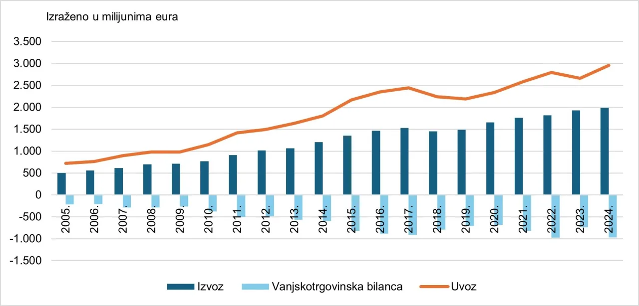 Slika 6. Izvoz, uvoz i vanjskotrgovinska bilanca Europske unije u trgovini začinima u razdoblju 2005. – 2024.